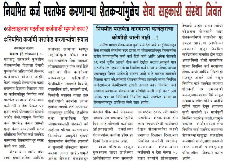तबस्सुम पठाण,भंडारा (दै.लोकजन) ः- महाराष्ट्र सरकारने नुकतीच शेतकऱ्यांना दिलासा देणारी पुण्यश्लोक अहिल्यादेवी होळकर कर्जमाफी योजना जाहीर केली.त्यामुळे शेतकऱ्यांना काही प्रमाणात दिलासा मिळाला.मात्र या कर्जमाफीतून नियमित कर्ज परतफेड करणाऱ्या शेतकऱ्यांना कर्जमाफी … Read More