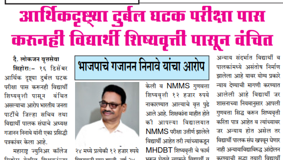 दै. लोकजन वृत्तसेवा सिहोरा:- १६ डिसेंबर-आर्थिक दृष्ट्या दुर्बल घटक परीक्षा पास करूनही विद्यार्थी शिष्यवृत्ती पासून वंचित असल्याचा आरोप भारतीय जनता पार्टीचे जिल्हा सचिव तथा विद्यार्थी पालक संघाचे अध्यक्ष गजानन निनावे यांनी एका प्रसिद्धी पत्रकांवर केला आहे.