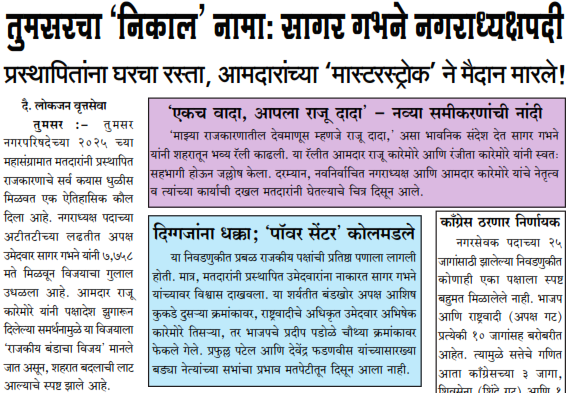 दै. लोकजन वृत्तसेवा तुमसर :- तुमसर नगरपरिषदेच्या २०२५ च्या महासंग्रामात मतदारांनी प्रस्थापित राजकारणाचे सर्व कयास धुळीस मिळवत एक ऐतिहासिक कौल दिला आहे. नगराध्यक्ष पदाच्या अटीतटीच्या लढतीत अपक्ष उमेदवार सागर गभने यांनी ७,७५८ मते मिळवून विजयाचा गुलाल उधळला आहे. आमदार राजू कारेमोरे यांनी पक्षादेश झुगारून दिलेल्या समर्थनामुळे या विजयाला “राजकीय बंडाचा विजय’ मानले जात असून, शहरात बदलाची लाट आल्याचे स्पष्ट झाले आहे. एकूण २५ जागांपैकी भाजपा १०, राष्ट्रवादी (अपक्ष गट) १०, काँग्रेस ३, शिवसेना (शिंदे गट)१ आणि अपक्ष १ असे चित्र समोर आले आहे. आता सत्तेच्या चाव्या कुणाकडे जाणार आणि फोडाफोडीचे राजकारण रंगणार की विकासाची युती होणार, याकडे संपूर्ण तुमसरचे लक्ष लागले आहे.