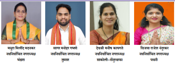 दै. लोकजन वृत्तसेवा भंडारा ः- ३ डिसेंबरपासून प्रतिक्षेत असलेला भंडारा जिल्ह्यातील भंडारा, तुमसर, साकोली-सेंदुरवाफा व पवनी नगरपालिकेचा निकाल आज घोषित झाला. भंडारा नगरपालिकेच्या नगराध्यक्षपदी भाजपाचे सौ. मधुरा मिलींद मदनकर, तुमसर नगरपालिकेच्या नगराध्यक्षपदी अपक्ष सागर मनोहर गभने, साकोली -सेंदुरवाफा नगरपालिकेच्या नगराध्यक्षपदी भाजपाचे सौ. देवश्री मनीष कापगते व पवनी नगरपालिकेच्या नगराध्यक्षपदी राष्ट्रवादी काँग्रेस अजित पवार गटाच्या सौ. विजया राजेश नंदुरकर ह्या निवडून आल्या.