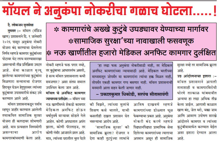 दै. लोकजन वृत्तसेवा तुमसर :- मॉयल (मॅग्निज खाण) प्रशासनाने दि. १ जानेवारी २०२६ पासून अनुकंपा नोकरी योजना बंद करण्याचा घेतलेला निर्णय म्हणजे कामगार कुटुंबांच्या पोटावर थेट लाथ मारण्यासारखा असल्याची तीव्र प्रतिक्रिया उमटत आहे. सेवा काळात मृत्यू झालेल्या कामगारांच्या कुटुंबांना मिळणारा सन्मानाचा रोजगार हिरावून घेऊन हेतुपुरस्सर त्यांच्या कुटुंबावर उपासमारीचे संकट उभे करण्यात आले आहे.